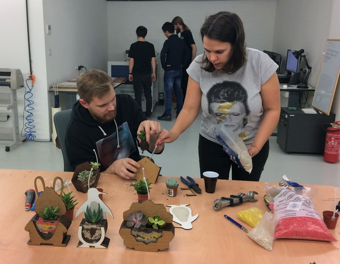 Už prvé skice naznačili, že fantázii sa medze klásť nebudú. Workshop sme tradične začali náčrtmi, základmi vektorovej grafiky v programe Corel Draw, až kým sme nevytvorili výsledný 2D model originálneho kvetináča. Jednotlivé časti z dreva či plexiskla potom zobral do parády laser.