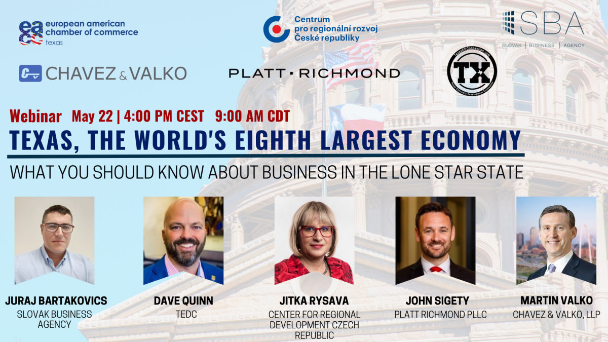 Webinár organizuje European American Chamber of Commerce, v spolupráci Slovak Business Agency a Centrom pre regionálny rozvoj Česká republika, spolu s odbornými znalosťami Platt Richmond PLLC, Chavez & Valko, LLP a Texas Economic Development Connection (TEDC).