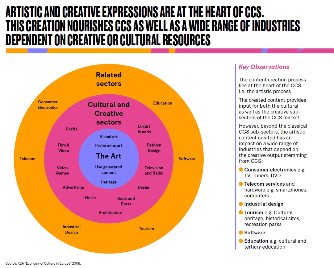 Jadrom kultúrneho a kreatívneho priemyslu (KKP) sú umelci, ktorí vytvárajú umenie vlastnými rukami. Tieto kreatívne procesy slúžia ako vstup do kultúrneho priemyslu ako sú galérie alebo divadlá. Nad tým sa nachádza kreatívny priemysel, ktorý tvorí napríklad reklama, film a video, videohry a tlačiarne, teda sektory inšpirované kreatívnymi a umeleckými procesmi.