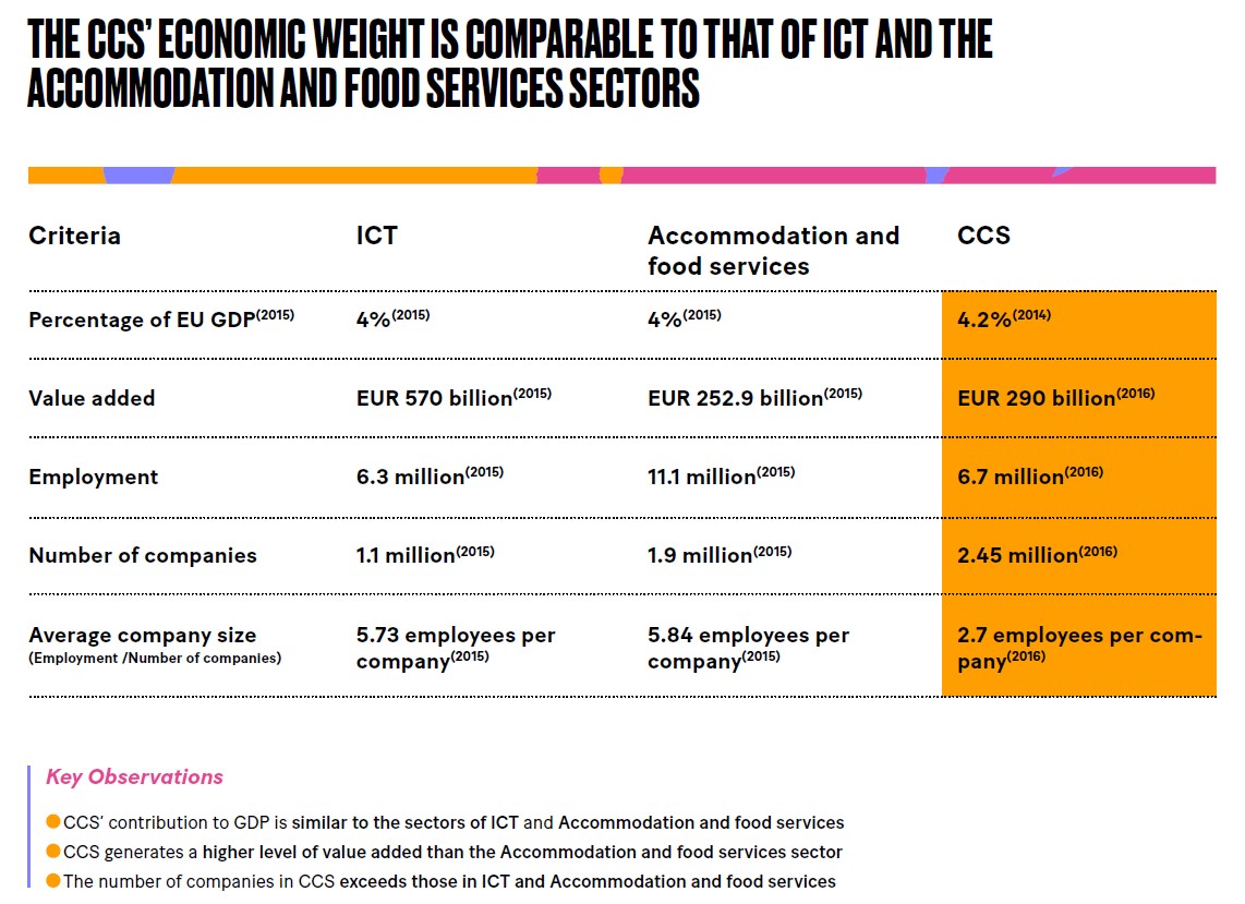 V Európskej únií zamestnáva kultúrny a kreatívny priemysel 6,7 milióna ľudí a do jej ekonomiky prispieva 4 %, čo je číslo porovnateľne s hodnotou informačných a komunikačných technológií (IKT) alebo ubytovaním a stravovacími službami. Zaujímavosťou je, že KKP prevyšuje vyššie spomenuté sektory počtom spoločností na trhu a prináša vyššiu hodnotu do ekonomiky ako sektor ubytovania a stravovacích služieb.