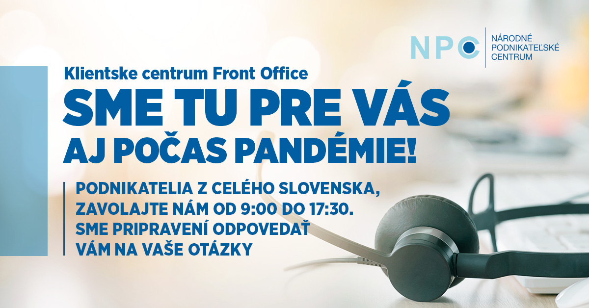 Klientske centrá Front Office fungujú ďalej. Zavolajte nám z ktoréhokoľvek kúta Slovenska. Ani počas pandémie, hoci všetci pracujeme v obmedzenom režime, sme naše klientske centrá Front Office nezavreli. Stále sa s nami môžete skontaktovať telefonicky a pýtať sa na všetky otázky, ktoré vás, v tejto pre podnikateľov neľahkej situácii trápia.