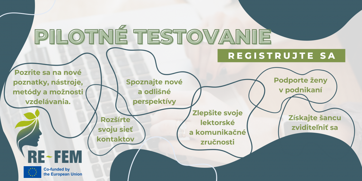 Cieľom projektu RE-FEM je posilniť postavenie žien podnikateliek prostredníctvom odbornej prípravy založenej na potrebách podnikateliek, aby boli ich podniky odolné aj v období kríz. V rámci projektu sa snažíme pomôcť školiteľom a mentorom pôsobiacim v oblasti vzdelávania dospelých dosiahnuť tento cieľ poskytnutím ľahko dostupných, vysokokvalitných školiacich nástrojov. Aj preto sa uskutoční Pilotné testovanie vzdelávacích materiálov, ktoré prináša projekt RE-FEM.