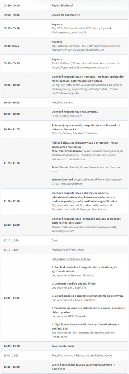 Potom je táto konferencia určená práve vám. Porovnáte si na nej rozdiely medzi Nemeckom a Slovenskom a inšpirujete sa riešeniami prispievajúcimi k zodpovednému hospodáreniu so zdrojmi v priemysle. Nebude chýbať ani priestor na networking.