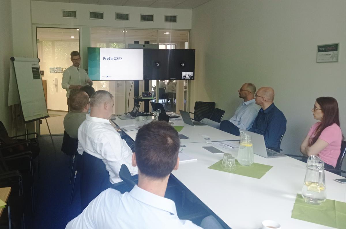 Druhá časť bola zameraná na prezentáciu stakeholderov a vzájomné zdieľanie informácií od účastníkov o aktuálnom dianí v téme na Slovensku spojené s diskusiou o adopcii OZE. Pani Lucia Bogdányová (SIEA) informovala o projekte LEAP to 11, ktorý sa zaoberá smernicou k energetickej efektívnosti. Pán Daniel Martauz (DM Technologies) informoval o možnosti využívania smart energetiky. Pán Ján Trnka (Corplex Slovakia) o zavádzaní solárnych panelov z dôvodu znižovania nákladov na spotrebu energie. Pán Róbert Komlóši (LH Energy Groupe) hovoril o inštalácii fotovoltických panelov a poznatkoch, ktoré prinášajú na Slovensko zo zahraničia, o nízkom povedomí, o problémoch s financovaním pri priemyselných inštaláciách a zdĺhavej administrácii. Pán Michal Belan (Pekáreň Kvetoslavov) hovoril o energetickej náročnosti prevádzky. Vzhľadom na narastajúce ceny energií museli navýšiť ceny a zachránila ich sieť vlastných distribučných sietí, kde sa nemuseli prispôsobovať cenotvorbe obchodných reťazcov. V súčasnosti aktívne zvažujú inštaláciu fotovoltickej elektrárne na strechu svojho závodu. Pán Miloš Gajdoš (ZSE) hovoril o opatreniach pre energetickú efektívnosť a návrhoch na investície s rýchlou návratnosťou (rozumná investícia). Pán Dávid Šmatlák prezentoval EEN a finančnú podporu na energetickú efektívnosť, o ktorú môže samostatný podnik požiadať do 15.5.2024 v rámci projektu EENergy. Ide o mikrogrant do výšky 10.000 EUR so zámerom dosiahnuť v podniku minimálne 5% úspor energií. Pán Tomáš Pavlík zastupujúci IT firmu pôsobiacu v oblasti vedy a výskumu, hovoril o možnom prepájaní riešení v oblasti energetiky.