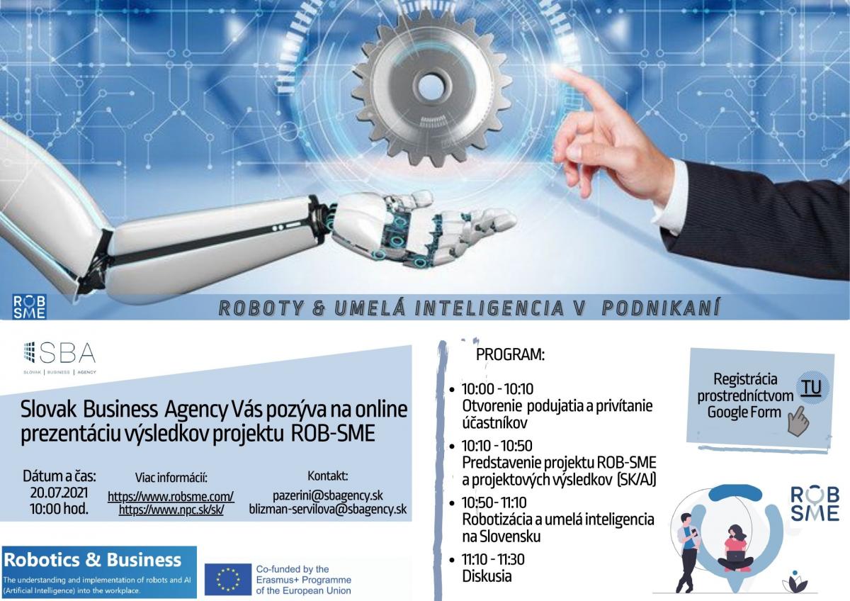 Vývoj nových technológií neustále napreduje a je preto dôležité vedieť, ako tieto technológie využívať vo svoj prospech. O tejto téme sa všetci záujemcovia budú môcť dozvedieť viac prostredníctvom online podujatia, počas ktorého budú prezentované výsledky projektu ROB-SME zameraného práve na tému nových technológií, konkrétne na integráciu robotov a umelej inteligencie do výrobného procesu podnikov.