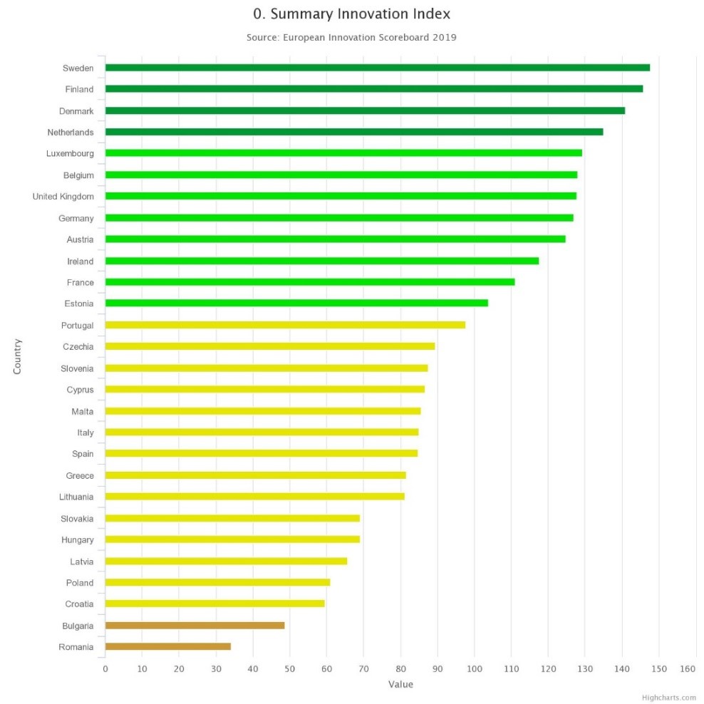 Za priemerom EÚ zaostáva vo viacerých hodnotených oblastiach, vrátane počtu inovujúcich malých a stredných podnikov (MSP), počtu inovujúcich MSP, ktoré spolupracujú s inými subjektmi, ale i v prípade indikátorov súvisiacich s duševným vlastníctvom[2].
