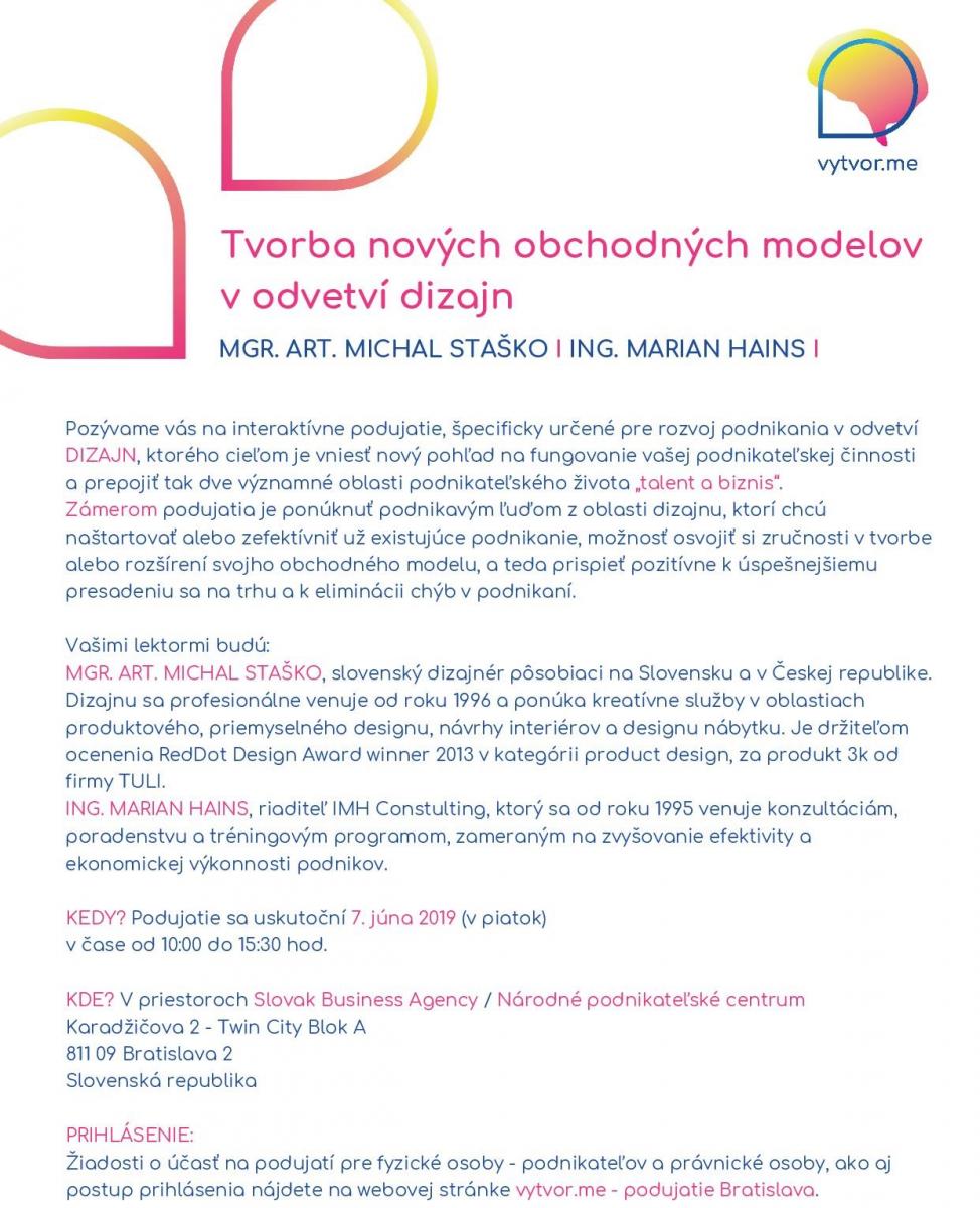 June 3, 2019 Slovak Business Agency Tvorba nových obchodných modelov v odvetví dizajn Chcem podnikaťPodnikámSBA