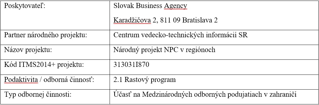 [1] Nefinančná forma pomoci je úspešným žiadateľom poskytovaná v rámci implementácie Národného projektu NPC v regiónoch, Prioritná os 12, kód ITMS2014+ 313041I861, v súlade s komponentom 3 písmeno b) Schémy na podporu malého a stredného podnikania v SR. Národný projekt je realizovaný prostredníctvom Operačného programu Integrovaná infraštruktúra a vytvára ucelený systém komplexnej podpory vzniku a rozvoja potenciálnych a existujúcich malých a stredných podnikov v SR.