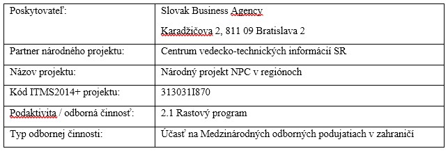 [1] Nefinančná forma pomoci je úspešným žiadateľom poskytovaná v rámci implementácie Národného projektu NPC v regiónoch, Prioritná os 12, kód ITMS2014+ 313041I861, v súlade s komponentom 3 písmeno b) Schémy na podporu malého a stredného podnikania v SR. Národný projekt je realizovaný prostredníctvom Operačného programu Integrovaná infraštruktúra a vytvára ucelený systém komplexnej podpory vzniku a rozvoja potenciálnych a existujúcich malých a stredných podnikov v SR.