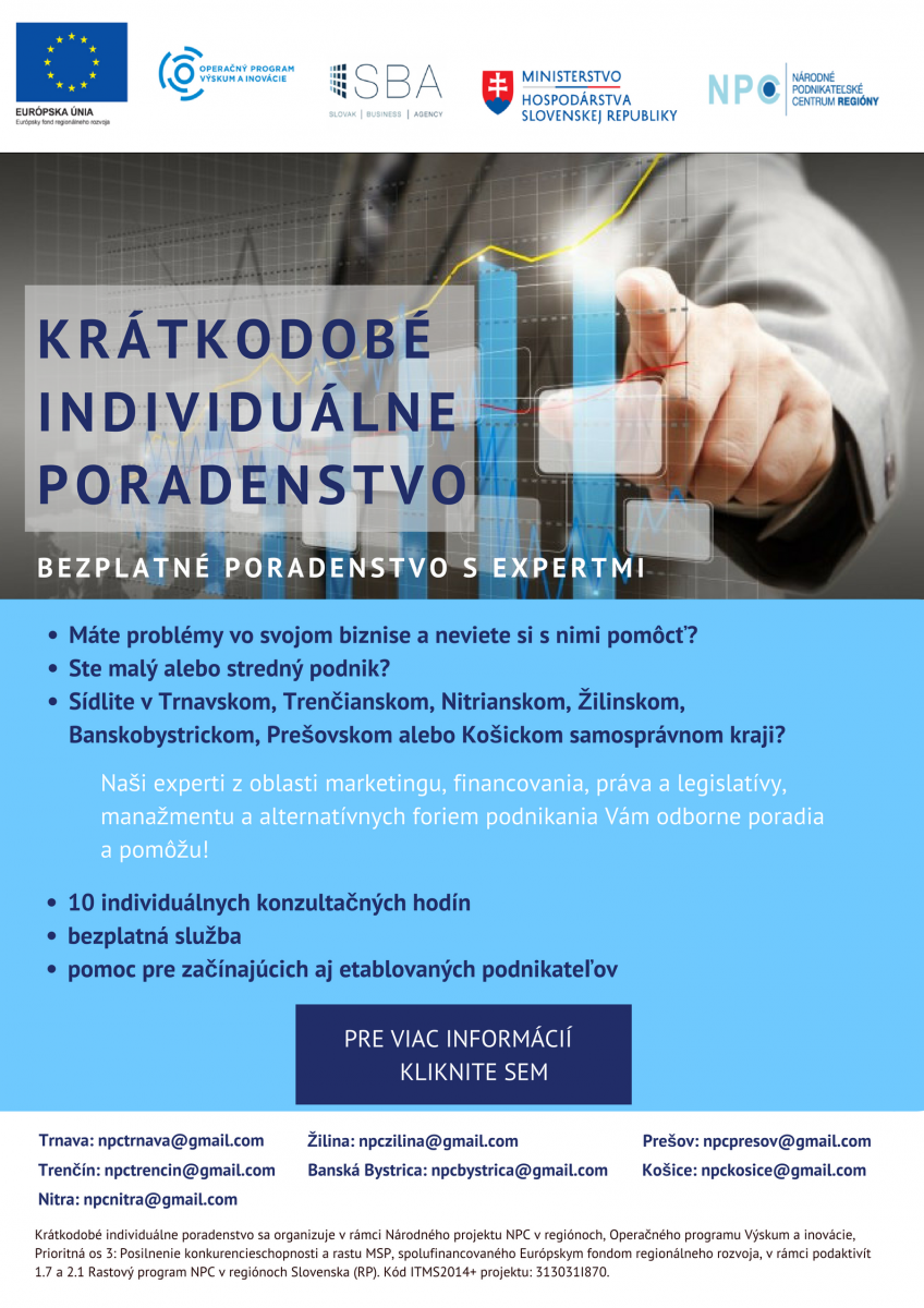 Výzva na predkladanie žiadostí o poskytnutie nefinančnej pomoci v rámci Rastového programu Národného projektu NPC v regiónoch – Krátkodobé individuálne poradenstvo