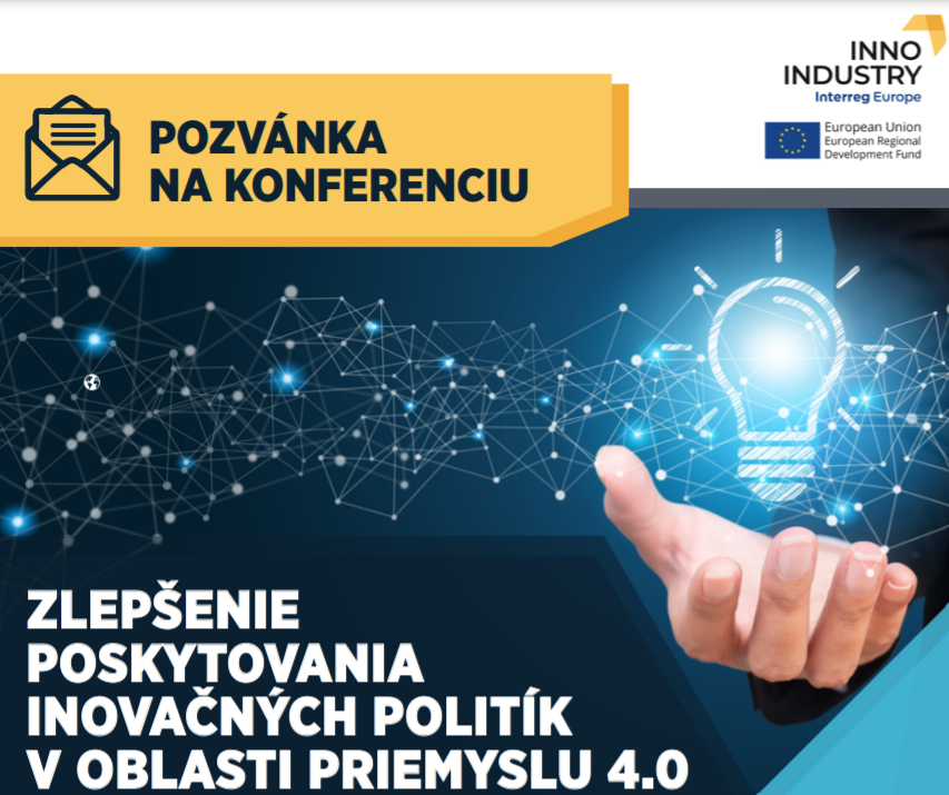 Pozývame vás na konferenciu projektu INNO INDUSTRY: „Zlepšenie poskytovania inovačných politík v oblasti priemyslu 4.0“, ktorá sa uskutoční online 19.01.2022 od 10.00 – 11.30. Počas konferencie budeme diskutovať o výsledkoch prvej fázy realizácie medzinárodného projektu INNO INDUSTRY, o zavedení Akčného plánu pre Slovensko do praxe a o úmysle zapojiť viaceré verejné inštitúcie do ďalšej fázy projektu.
